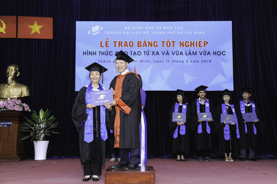 On May 11, 2019, the 1st Graduation Ceremony in 2019 was held at Ho Chi Minh City Open University for the training mode of part-time and distance education, the ceremony took place in a solemn and warm atmosphere. Attending the Ceremony were the presence of teachers and students, especially the participation of relatives and friends of more than 300 new bachelors and engineers in the fields of Economic Law, Business Administration, Accounting, Economics specialized in Economics and Law, Construction Engineering Technology specialized in Civil and Industrial Construction, Construction Engineering Technology specialized in Water Supply and Drainage, English language, Social Works, Banking and Finance, English Language specialized in Business English, Social Studies specialized in Social Studies on Organization and Human Resource Management, Computer Science, Computer Science specialized in Computer Network, English Language specialized in Teaching Methods, and Biotechnology.
